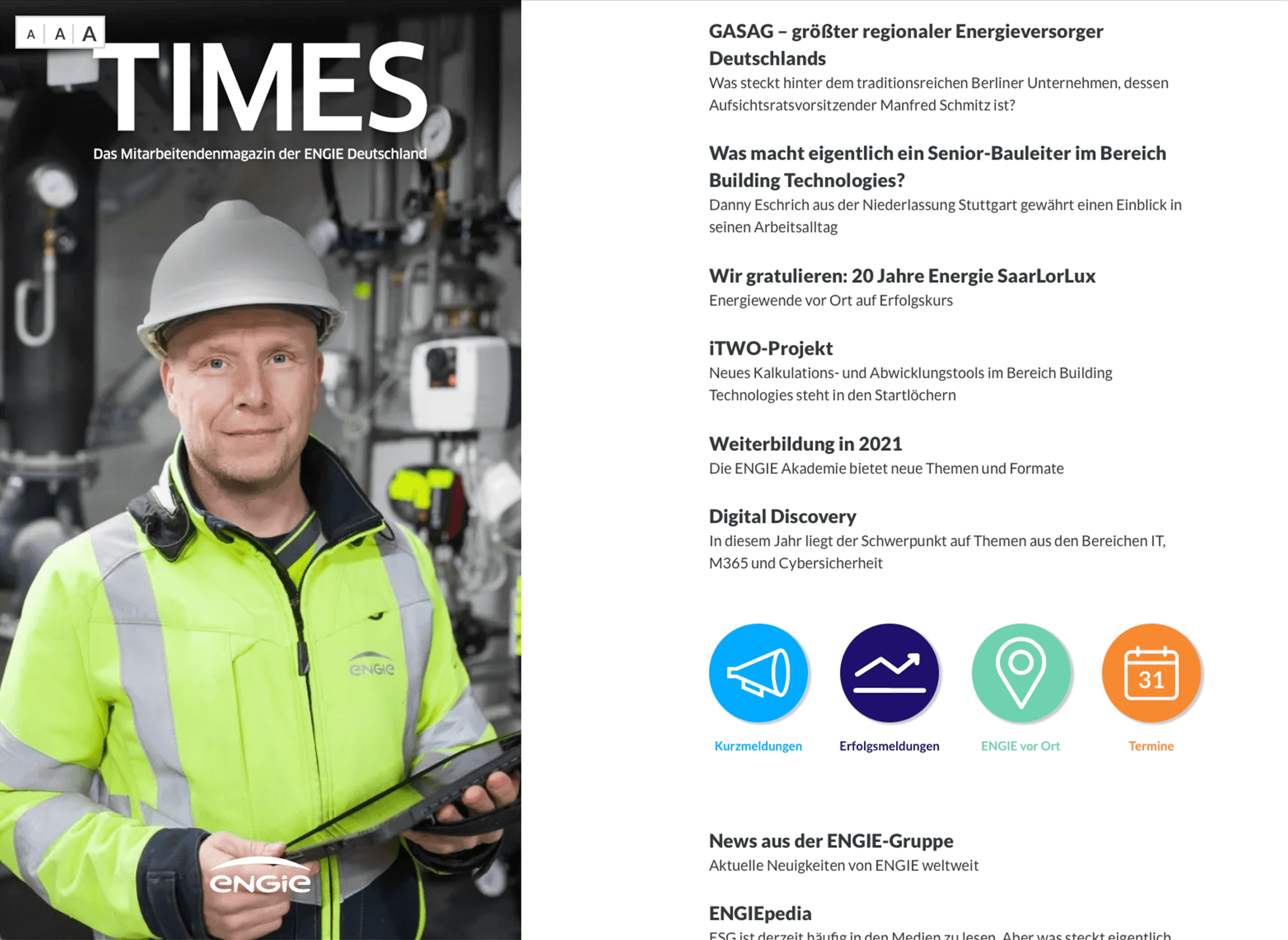 Als innovatives Energieunternehmen treibt ENGIE Deutschland aktiv die Energiewende voran: weniger CO2, mehr digitales Denken. Das gilt auch für ENGIEs Mitarbeitendenmagazin TIMES. Wir brachten das Magazin ins Netz.