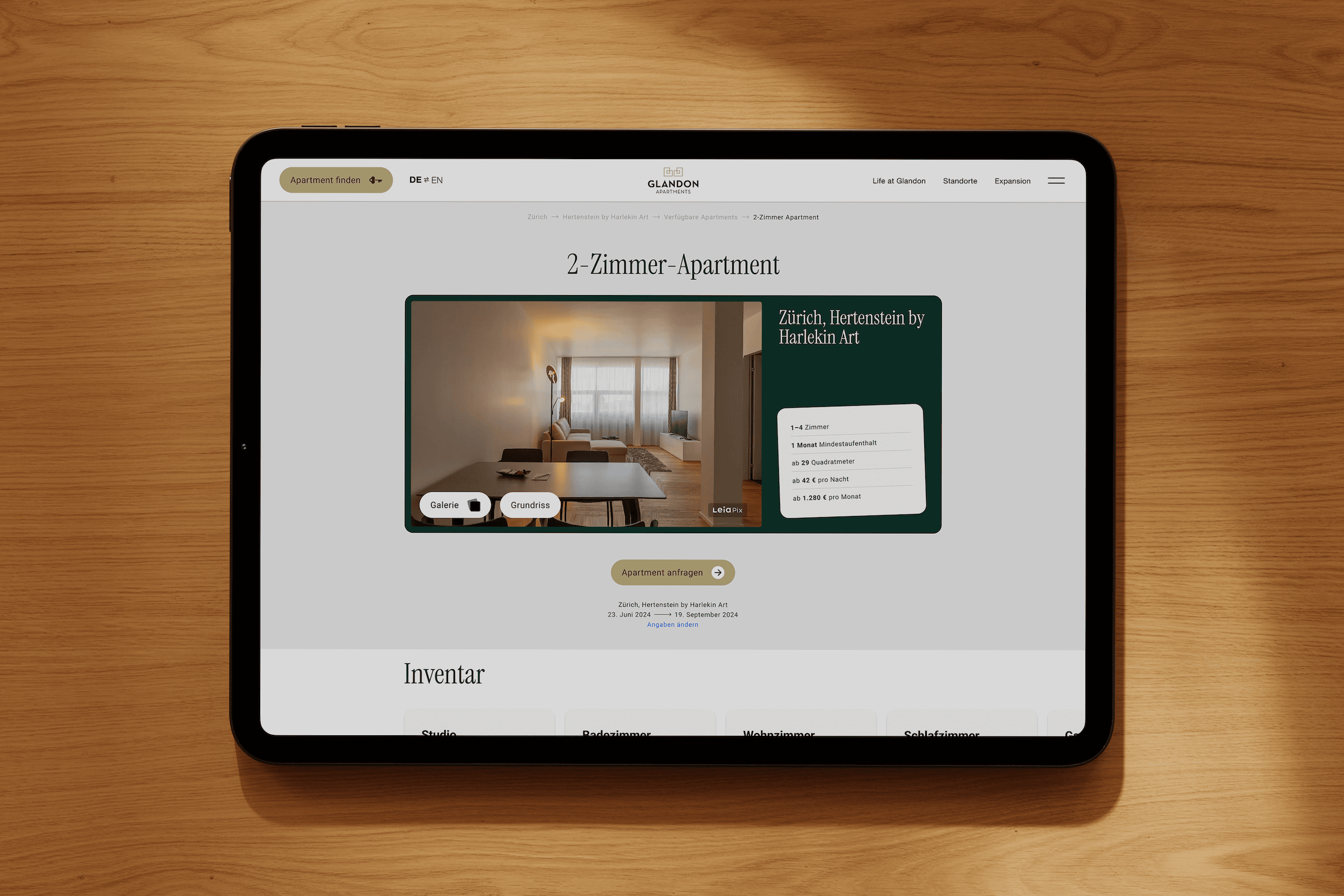 Aus dem geplanten Redesign entstand ein viel umfassenderes Projekt. Neue Ideen wurden direkt mitgedacht – wie GLANDON ROOMS, ein Angebot für Kurzzeitmieten mit digitalem, kontaktlosem Check-in. Ideal für alle, die für wenige Tage eine verlässliche Unterkunft suchen. GLANDON ROOMS wurde als Submarke mit eigenem Stil entwickelt, bleibt aber klar Teil der GLANDON-Familie.